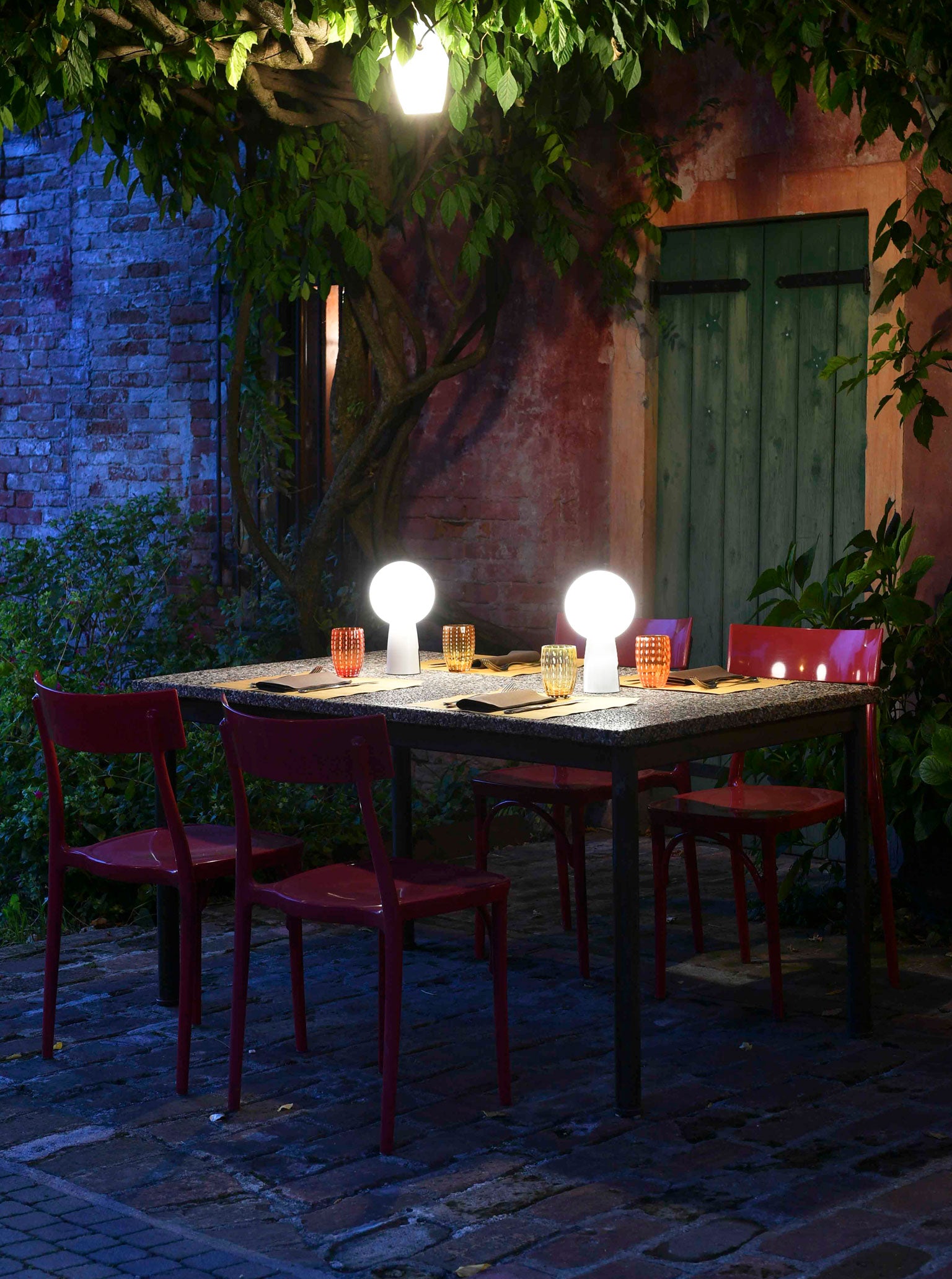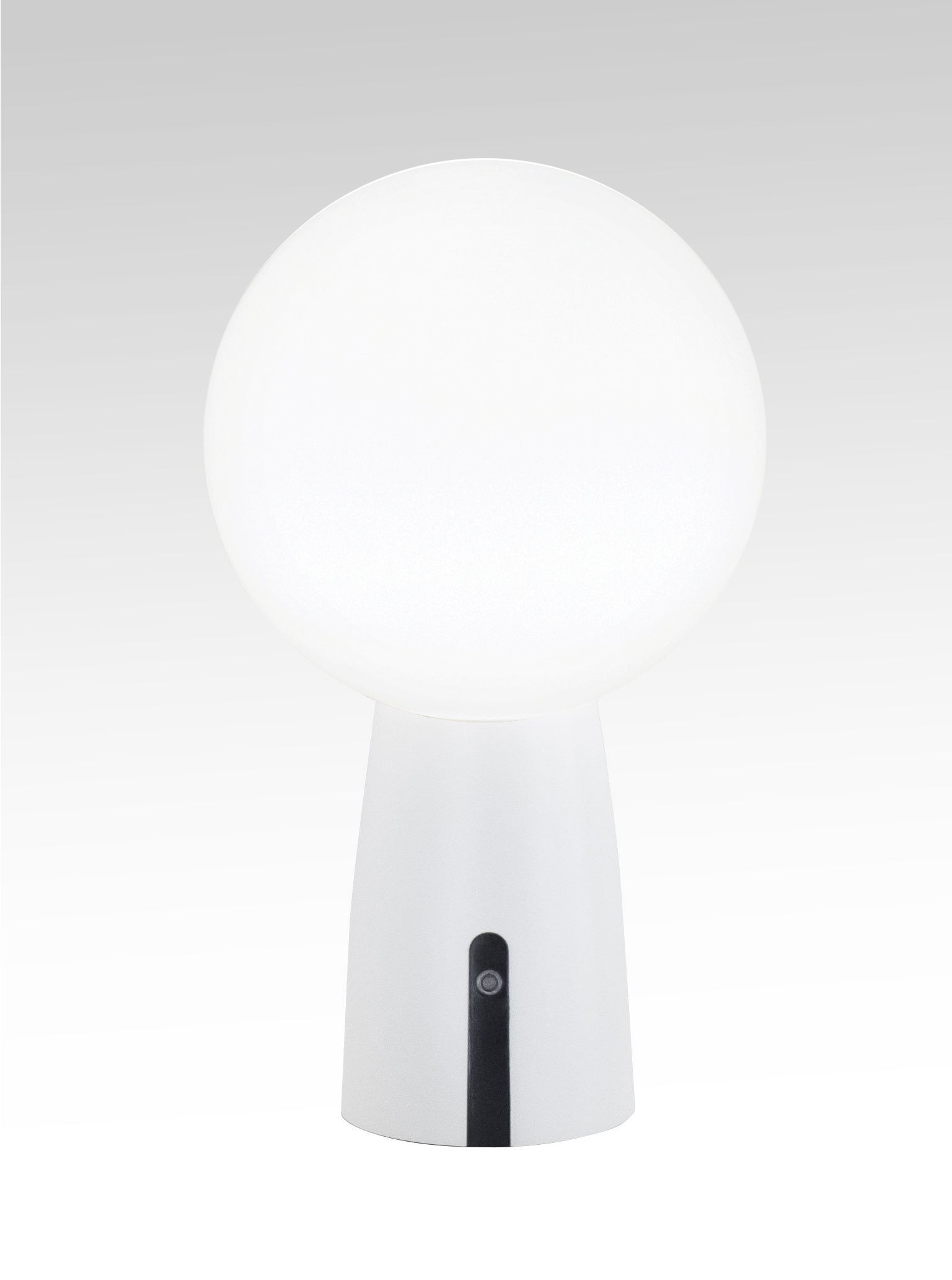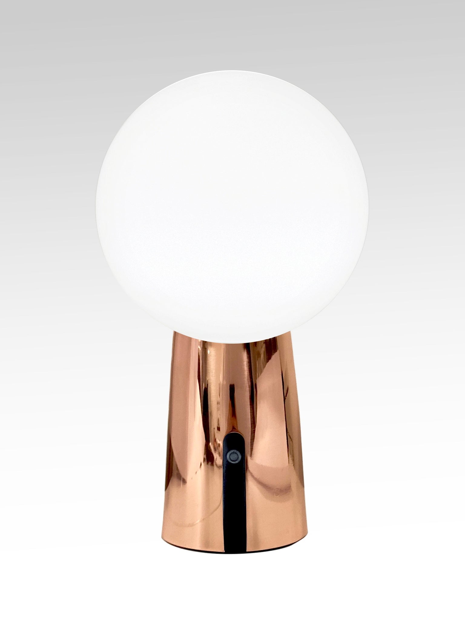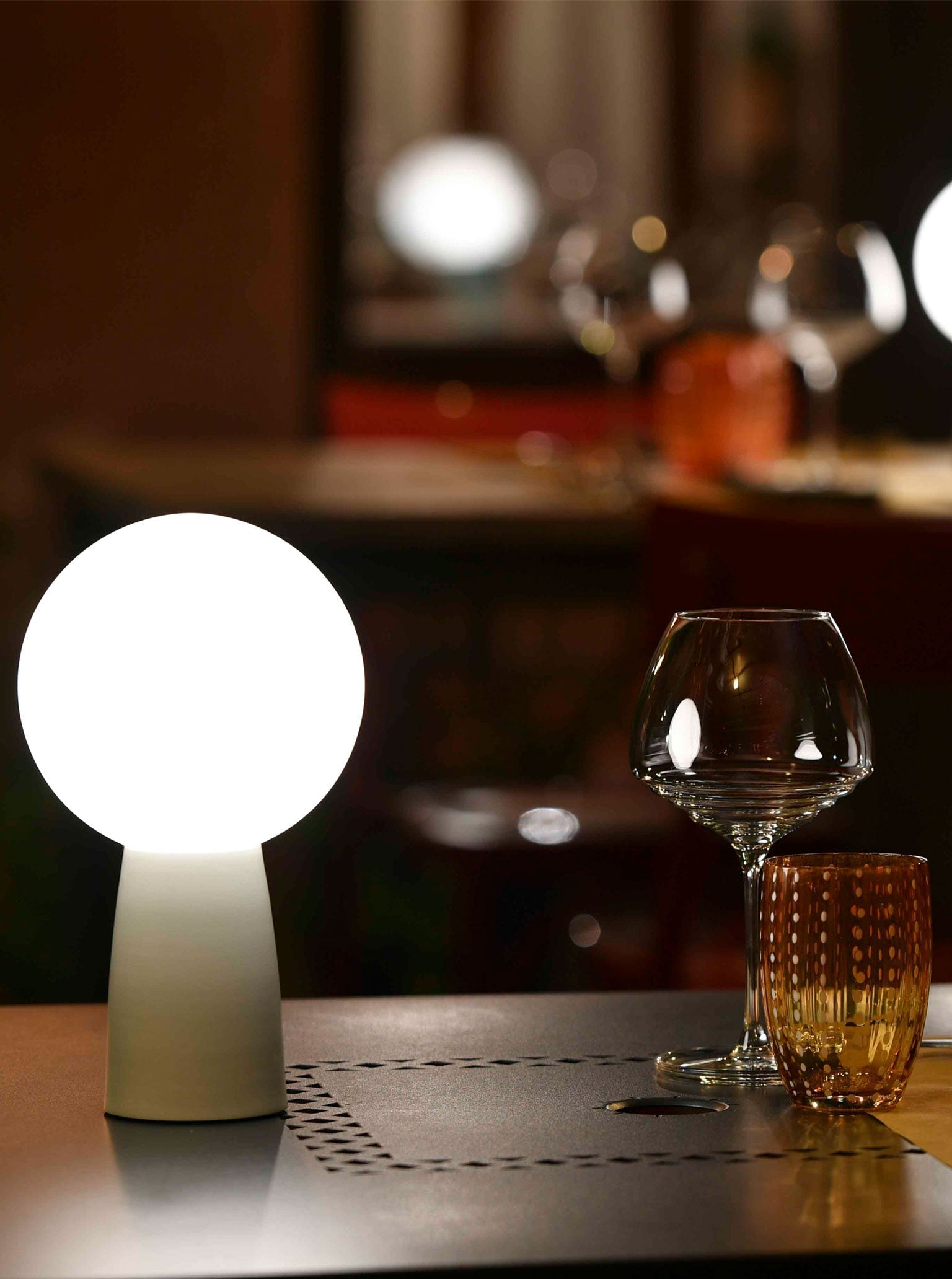 To recharge your Olimpia Pro table lamp, plug the charging cube provided into an outlet, then plug the USB connector from the charging cradle into the cube. Place the lamp on the charging cradle. The power button on the side of the lamp will glow red while charging and turn green once the charging cycle is complete. A full charge takes around 9 hours. The fully charged lamp may remain on the charging cradle without damaging the battery.