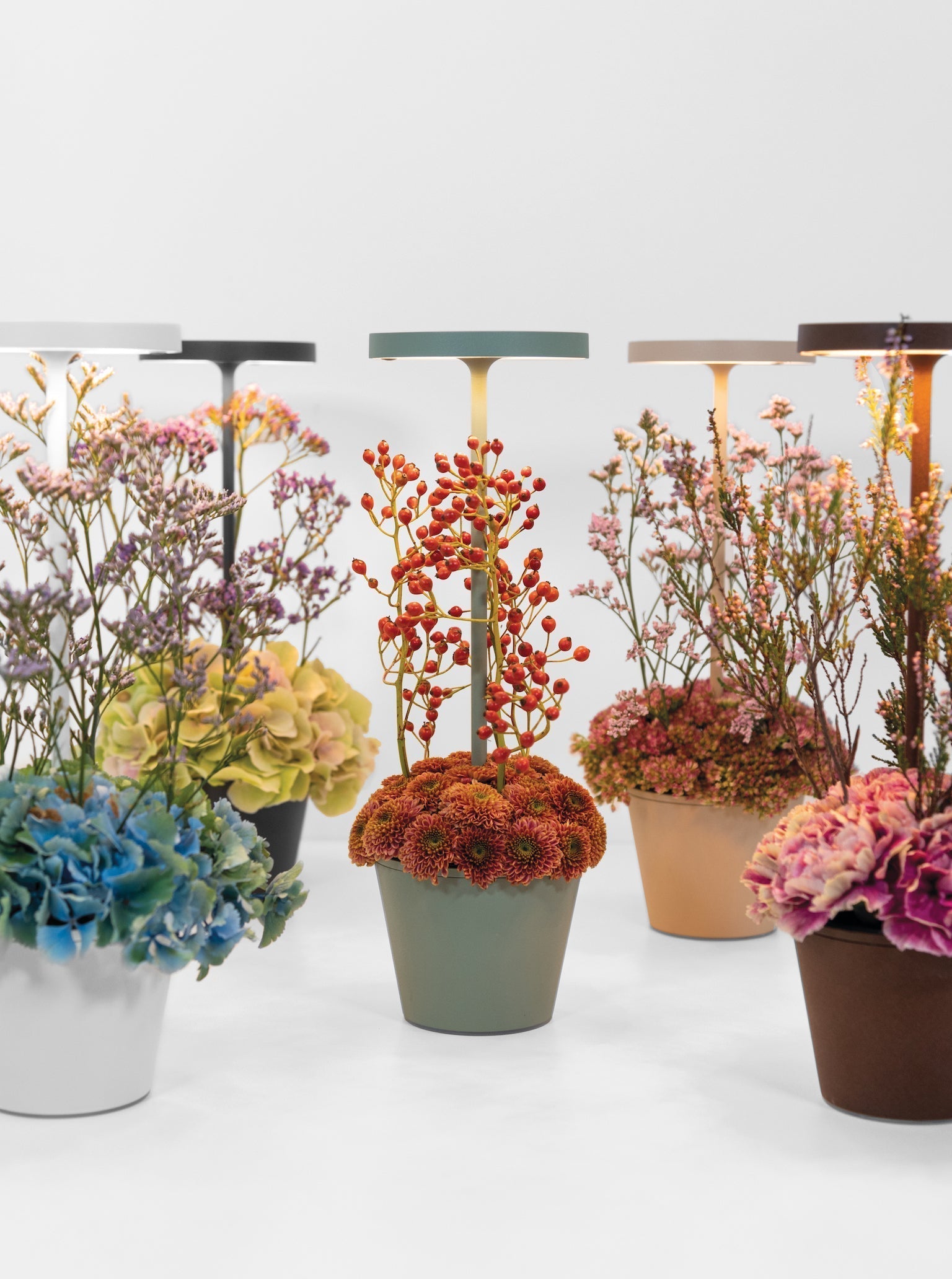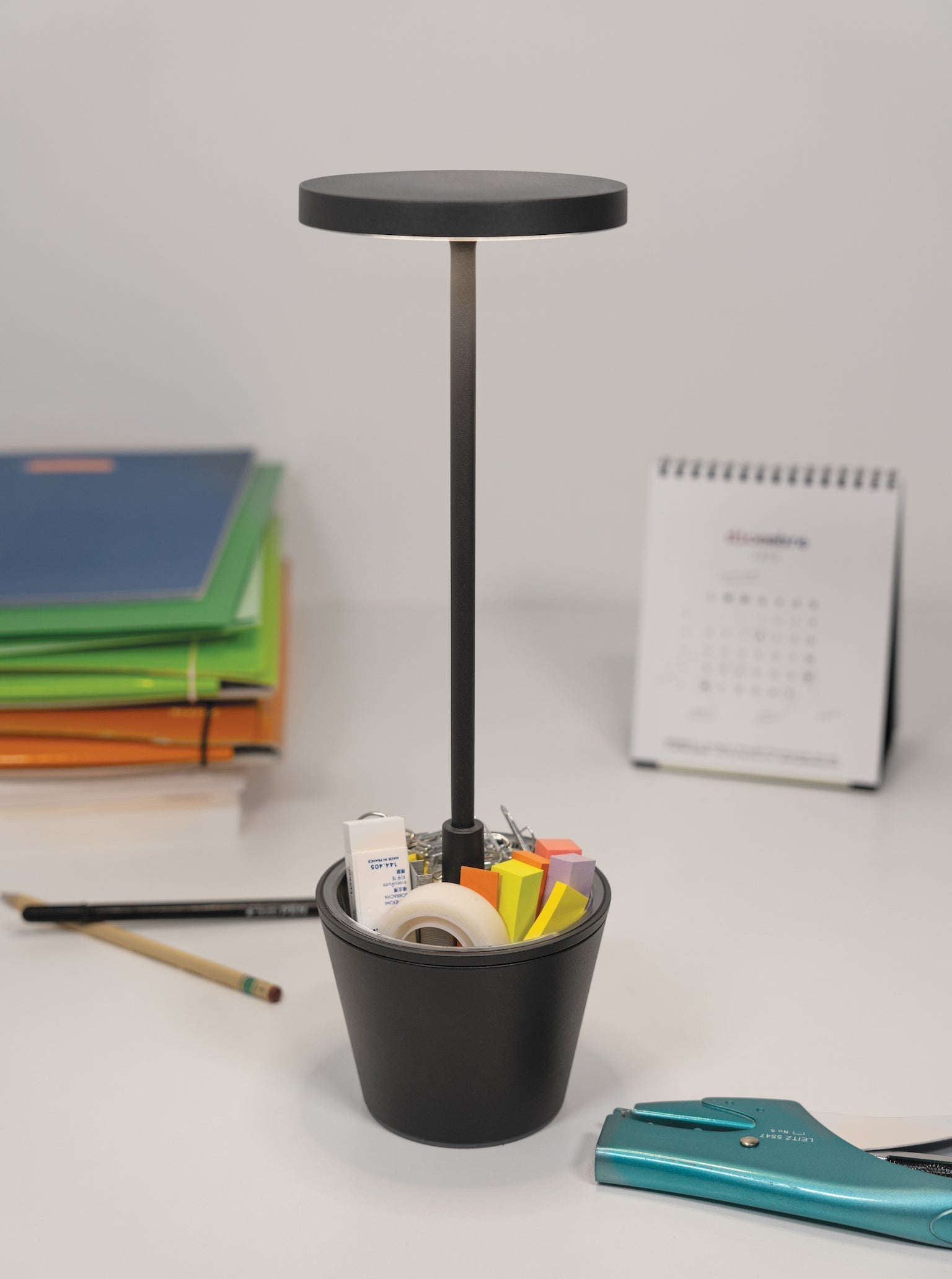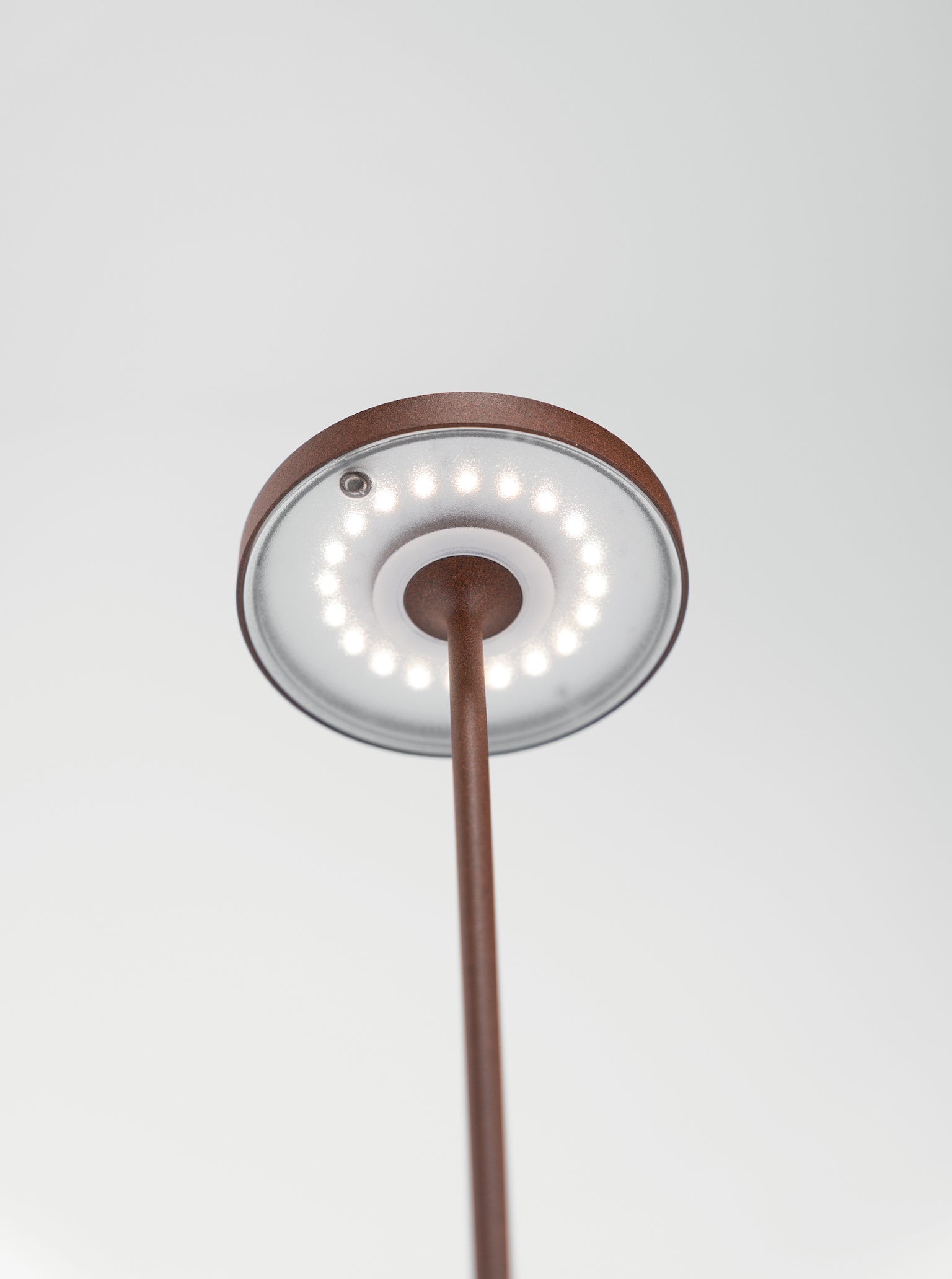 To charge the lamp, connect the USB cable to the adaptor and plug into an electrical socket. Place the lamp on the charging base. When fully charged, disconnect the plug from the electrical socket. A quick tap on the top of the lamp turns it on and off. When the lamp is switched on, lightly press the touch sensor to obtain the desired brightness. Every time you turn it on, the light intensity returns to 100%.